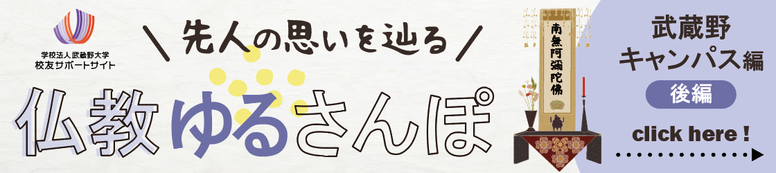 今回ご紹介したスポットの他にも武蔵野キャンパスにはまだまだたくさんの仏教にまつわるスポットがあります。後編では仏教教育事務課アオヤマ課長に雪頂講堂や高楠順次郎先生の胸像、散華乙女の記念樹碑を案内していただきます。こちらもお楽しみに♪