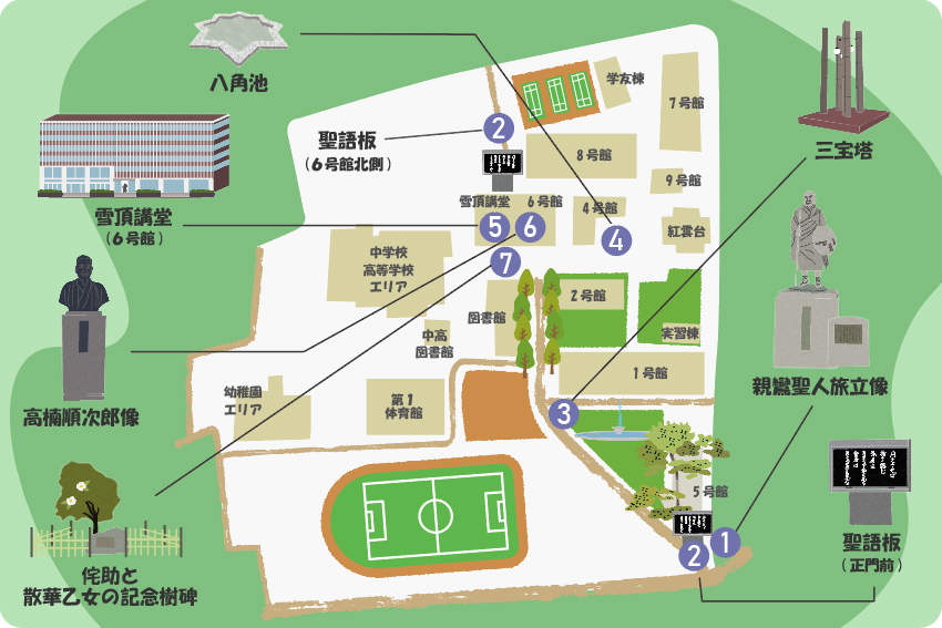 学祖高楠順次郎先生の建学の精神や、それを受け継いでいこうという先生方の強い想い。そしてそこかしこから感じられる先輩たちの息吹。解き明かされたストーリーを片手に、あらためて武蔵野キャンパスを「ゆるさんぽ」してみてくださいね♪