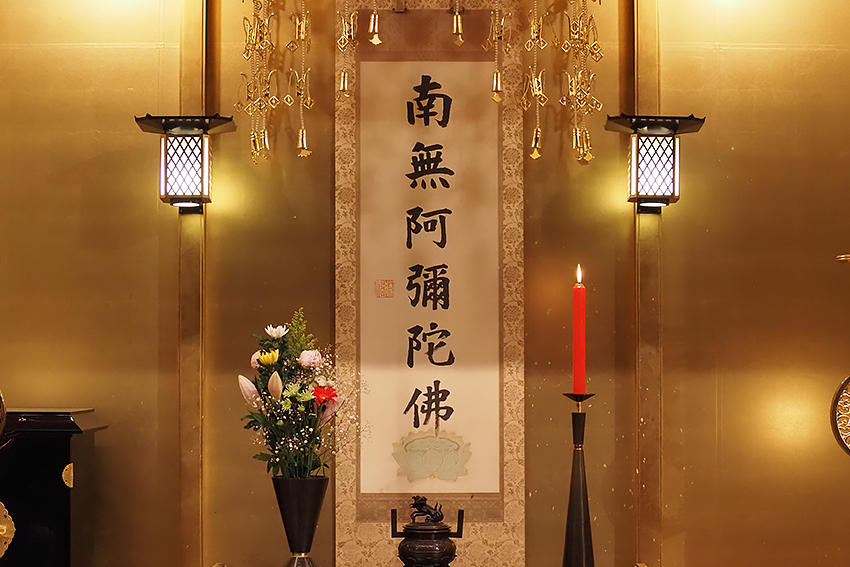 雪頂講堂ステージ上のお仏壇に安置され、いつもわたしたちを静かに見守ってくださっているのがThe ご本尊「南無阿弥陀仏」の六字名号です。こう言われてもまだピンとこない方も多いかもしれません。注目すべきは掛け軸に揮毫された「南無阿弥陀仏」の六文字なのです。