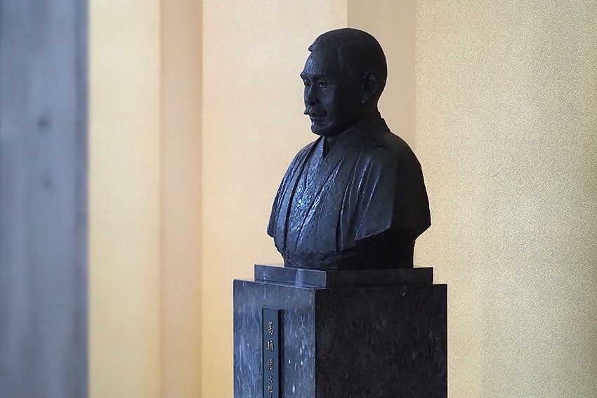 雪頂講堂のロビー正面にどーんと鎮座するのは学祖高楠順次郎先生の胸像です。その眼光の鋭さに多少腰が引けつつも「立派な口ひげだなぁ」とか「結構福耳なのね」なんてしげしげと眺めるのもよいものです。