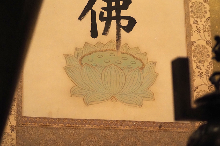 雪頂講堂のご本尊は、本願寺第23代宗主である勝如上人(光照前門主)が昭和22年11月に揮毫されたもので、名号に添えられている蓮台は野生司香雪画伯によるもの。入仏式にあわせて表装もきれいになりました。意味をきちんと理解すると、蓮台の上に仏さまが立っているように見えてくるからふしぎなものです。