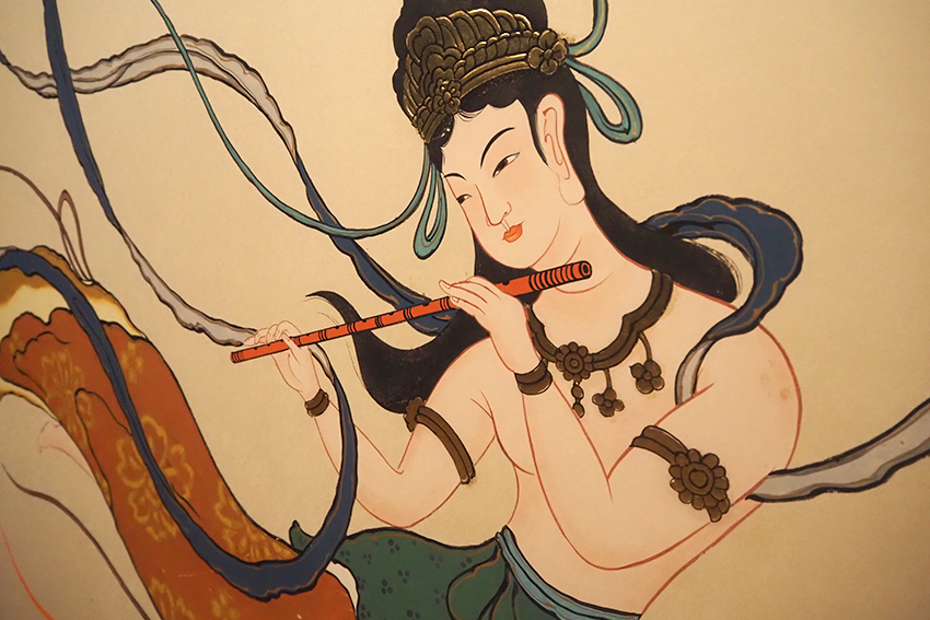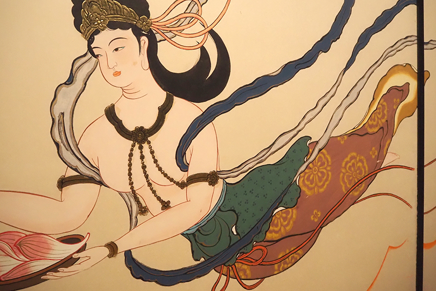 ステージ上でひときわ目を引くのが飛天の描かれたふすま絵です。二体の飛天の慈愛に満ちた面差し、体を縁取る柔らかな曲線、深みのある色彩。「よくわからないけど、これはきっと何かものすごいものに違いない!」と思っている方も多いのでは?
