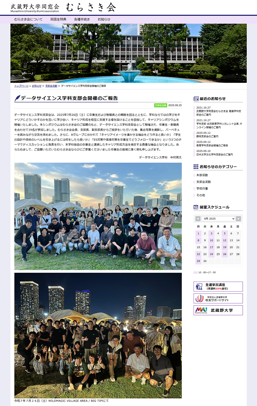2025.09.17校友トピックスデータサイエンス学科支部会開催のご報告|むらさき会-武蔵野大学同窓会 ポスト いいね! LINEで送る むらさき会Webサイトにて支部会活動のページが更新されました。データサイエンス学科支部会開催のご報告|むらさき会-武蔵野大学同窓会ぜひご覧ください。