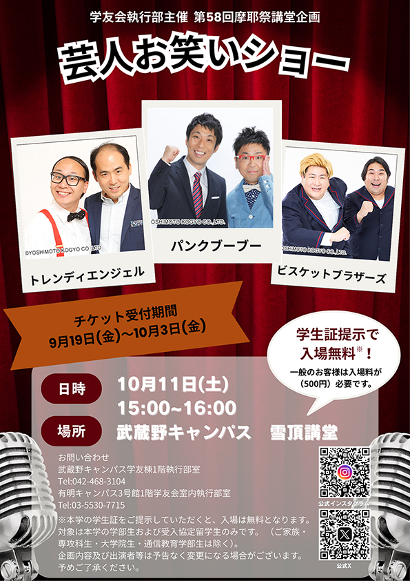 摩耶祭初日、11日(土)の講堂企画はトレンディエンジェル、パンクブーブー、ビスケットブラザーズによるお笑いショー!日頃のストレスを忘れて思いっきり笑ってください!