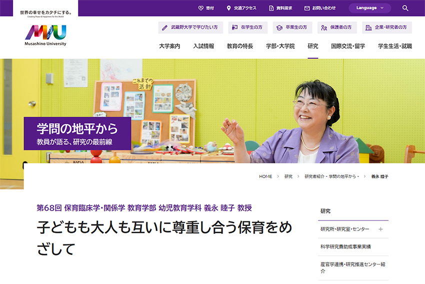 2025.10.20校友トピックス第68回 保育臨床学・関係学 教育学部 幼児教育学科 義永 睦子 教授|学問の地平から ポスト いいね! LINEで送る 子どもも大人も互いに尊重し合う保育をめざして 大学公式サイトの研究者紹介「学問の地平から 教員が語る、研究の最前線」のページが更新されました。https://www.musashino-u.ac.jp/research/interview/68_yoshinaga/index.htmlぜひご覧ください。