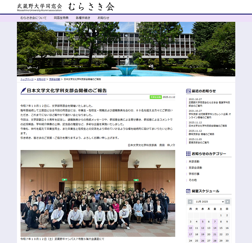 2025.11.14校友トピックス日本文学文化学科支部会開催のご報告|むらさき会-武蔵野大学同窓会 ポスト いいね! LINEで送る むらさき会Webサイトにて支部会活動のページが更新されました。日本文学文化学科支部会開催のご報告|むらさき会-武蔵野大学同窓会ぜひご覧ください。
