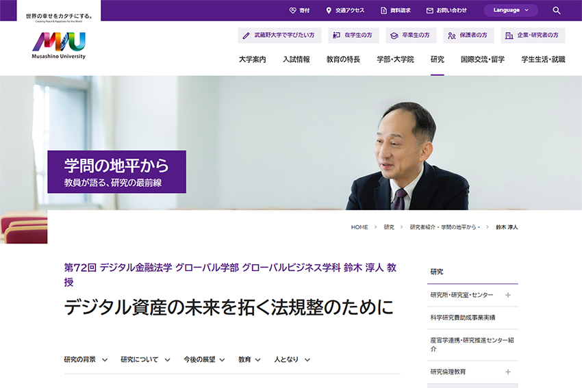 2025.12.12校友トピックス第72回 デジタル金融法学 グローバル学部 グローバルビジネス学科 鈴木 淳人 教授|学問の地平から ポスト いいね! LINEで送る デジタル資産の未来を拓く法規整のために 大学公式サイトの研究者紹介「学問の地平から 教員が語る、研究の最前線」のページが更新されました。https://www.musashino-u.ac.jp/research/interview/72_suzuki/ぜひご覧ください。