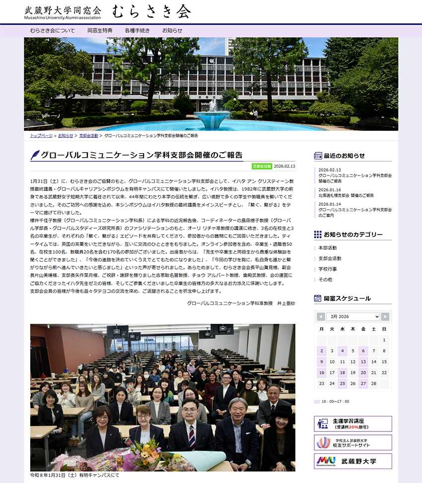 2026.02.17校友トピックスグローバルコミュニケーション学科支部会開催のご報告|むらさき会-武蔵野大学同窓会 ポスト いいね! LINEで送る むらさき会Webサイトにて支部会活動のページが更新されました。グローバルコミュニケーション学科支部会開催のご報告|むらさき会-武蔵野大学同窓会ぜひご覧ください。