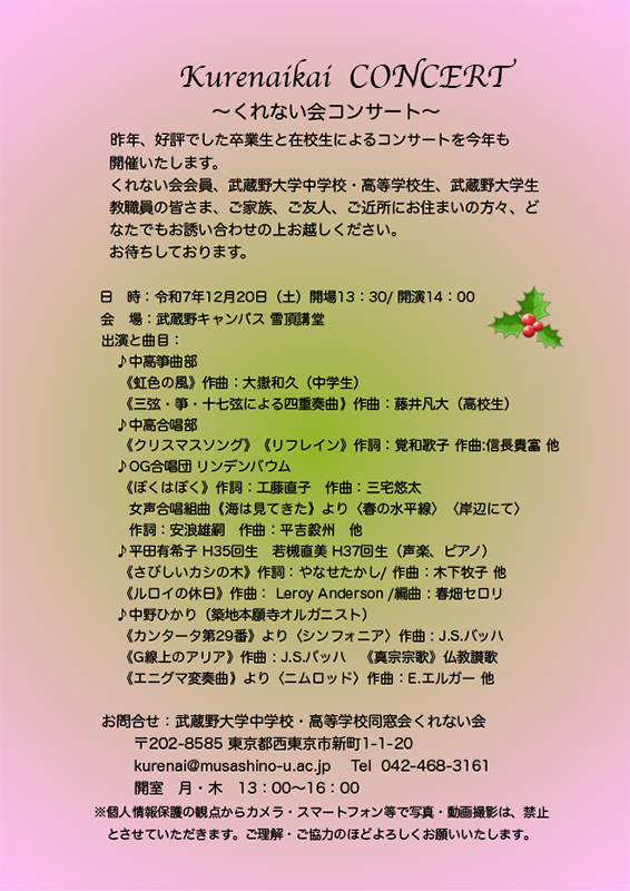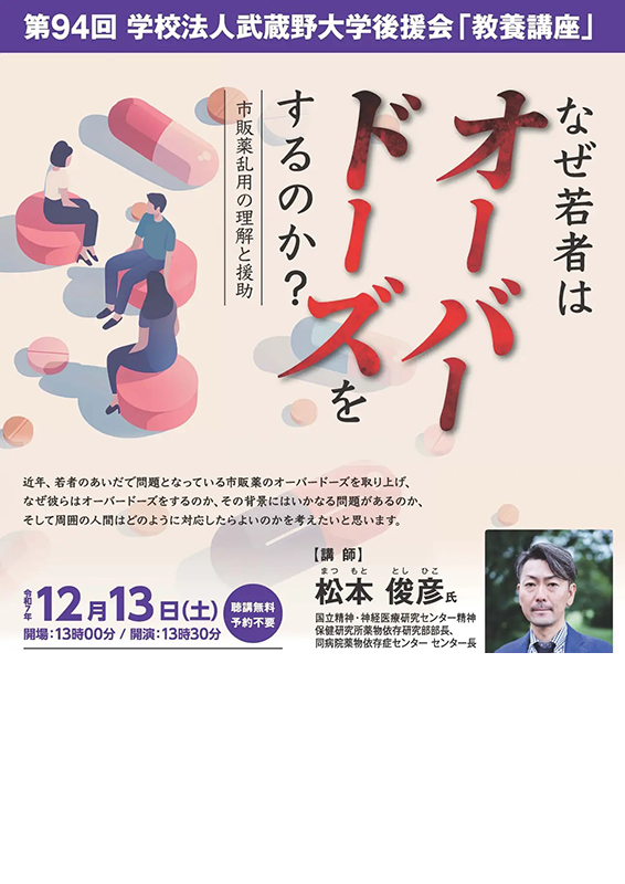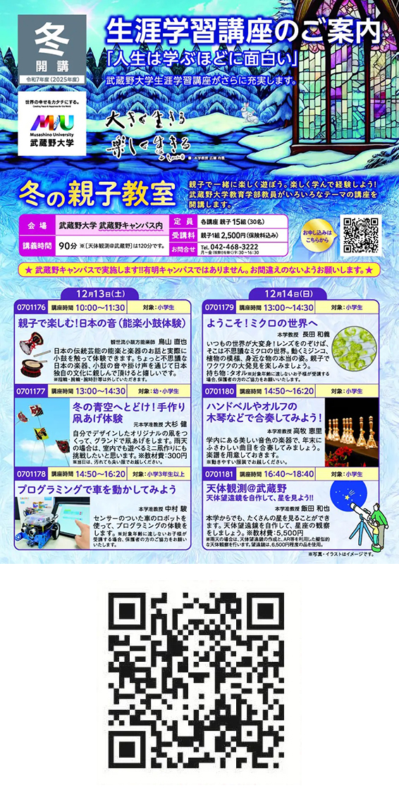 気が付けばもう12月。今年もあっという間でしたね。慌ただしさの増す師走ではありますが、武蔵野大学ではイベントが盛だくさん♪ぜひぜひ足をお運びください!